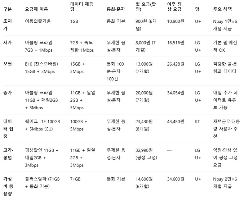 그래서 2025년 5월 최근 정보를 토대로, 초저가부터 데이터 집중형까지 총 7가지 요금제를 정리했어요.