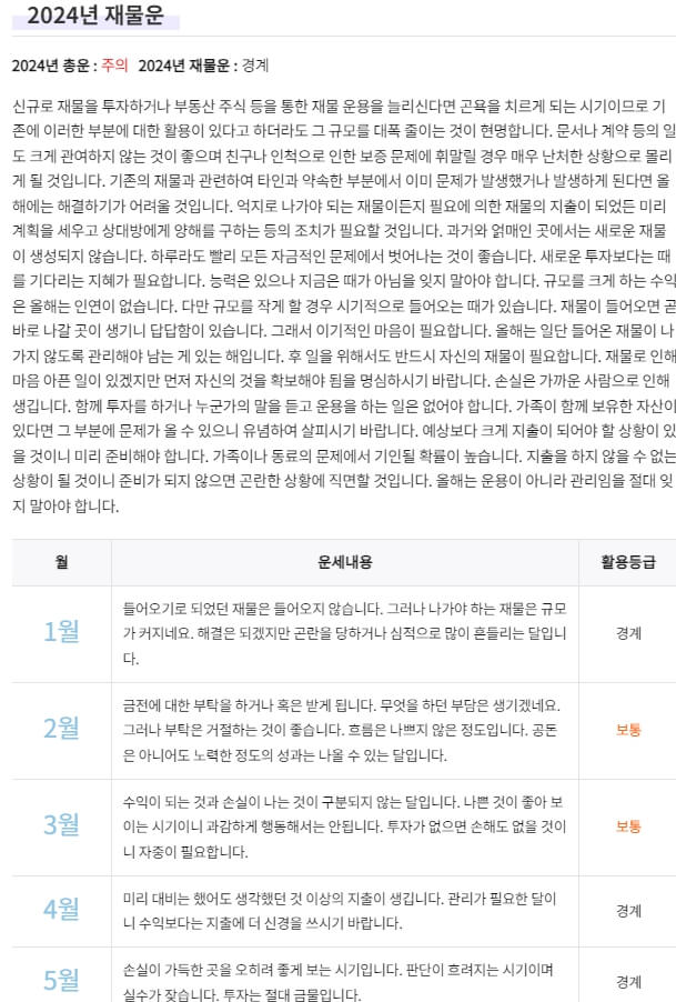 2024년 재물운과 월별 운세가 정리 되어 나옵니다.