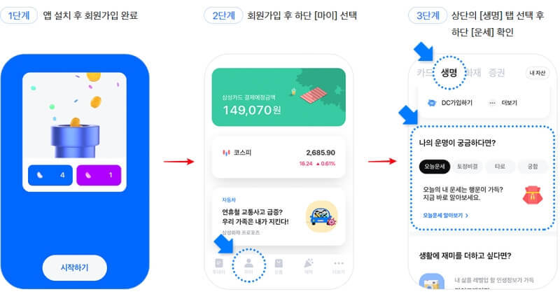 앱을 설치하여 회원가입 후 '마이' > 상단의 '생명' > 운세보기