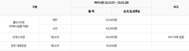 인위적으로 뽑아내는 온천이 아닌 자연적으로 솟아나는 온천수입니다. 야외 노천탕, 스파월드, 어린이 슬라이더, 가족 온천탕 등 다양하게 온천을 즐길 수 있습니다. 비수기 성수기 요금이 다릅니다. 온천 이용시간은 오전 6시부터 오후 10시까지며 호텔 체크인은 오후 3시, 다음날 오전 11시까지입니다. 스파월드 이용시간은 오전 10시부터 오후 7시, 주말은 오후 8시까지입니다.