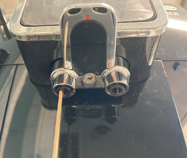 6. 커피 추출구는 주기적으로 닦아 주어야 합니다. 추출구의 구멍이 막히지 않았는지 이쑤시개로 커피 잔여물을 제거해주세요.