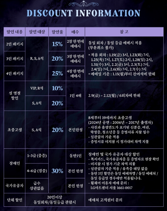 - 설 명절 할인 10%할인 (VIP, R석) / 20%할인 (S, A석) = 2.9(금) ~ 2.12(월) 6회차에 한해 1인 4매