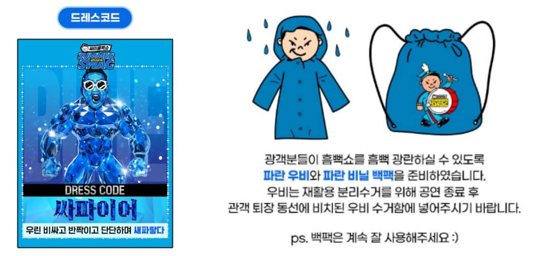늘 그랫듯이 파란색이 드레스코드입니다. 제공되는 물품은 방수 가방, 우비, LED 너클 밴드입니다.
