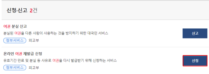2. 화면을 조금만 내리면 신청. 신고 부분에 '온라인 여권 재발급 신청'을 클릭합니다.