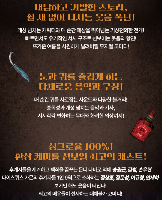 뮤지컬 가 돌아왔습니다. 배우들의 몸사리지 않는 연기와 환상적인 호흡으로 관객들에게 웃음을 선사하고있습니다. 대극장 뮤지컬과 쟁쟁한 대결을 벌이며 예매 1위를 기록했으며, 재관람 고