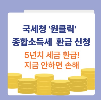 놓친 종합소득세 환급, '원클릭'으로 한 번에 신청하세요! 최대 5년 치 환급금을 손쉽게 돌려받을 수 있는 기회입니다.