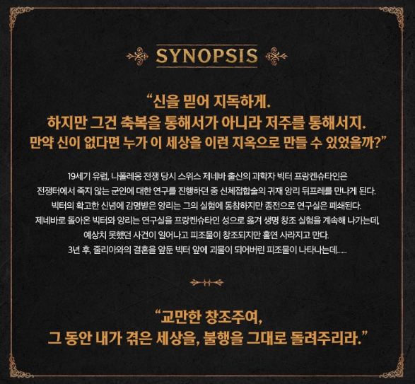뮤지컬 프랑켄슈타인은 19세기 유럽, 과학자 빅터는 군의 요청으로 '죽지 않는 군인'을 연구합니다. 빅터의 친구 앙리와 함께 실험을 계속하며 새로운 생명체를 만들어 냅니다. 하지만 생명체는 괴물이 되어 빅터에게 복수를 시작합니다.