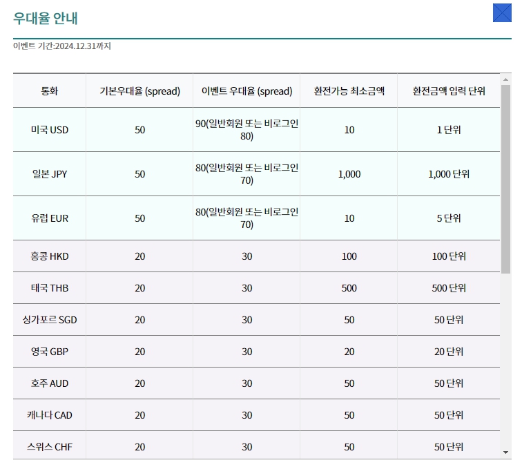 기본 통화는 70~90% 환율 우대가 적용되고, 나머지 통화들은 30~50% 적용 됩니다.