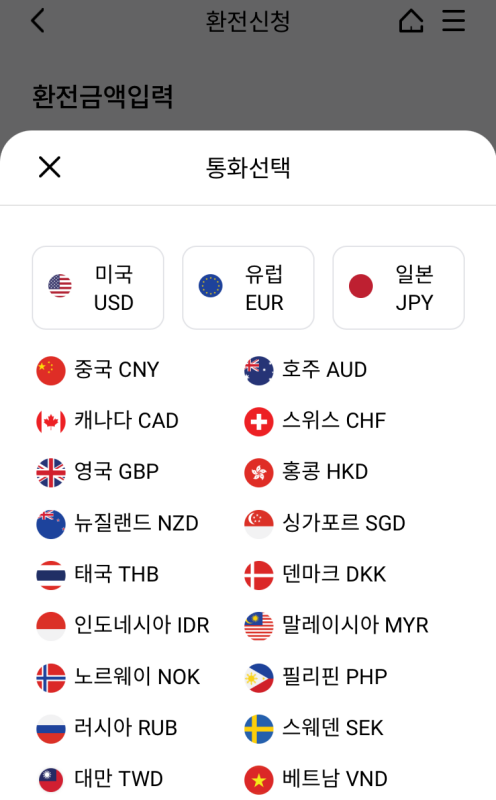 4. 환전 통화 종류를 선택하고 환전할 금액을 입력합니다.