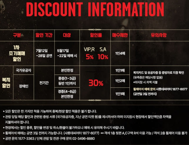 - 1차 조기예매 할인 (7월 12~28일 공연) 5월 17일~22일 예매 시ㅡ> VIP, R석 5% 할인, S, A석 10% 할인