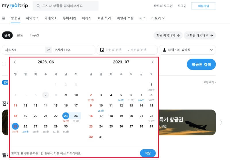 1. 항공권 가격이 실시간으로 업데이트되며, 마이리얼트립에서 제공하는 무료 항공권 이벤트 카드사 적립금, 할인 쿠폰, 항공사 프로모션 등을 한눈에 볼 수 있습니다.