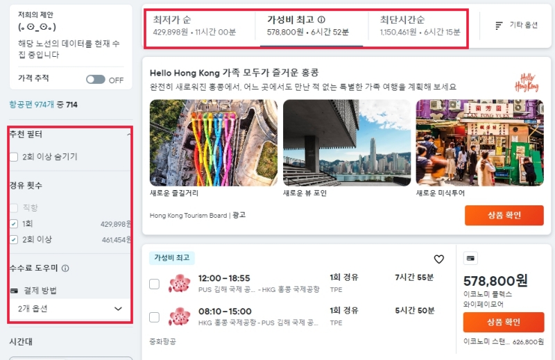 2. 최저가, 가성비 항공권, 최단 시간 추천은 한눈에 볼 수 있어 편리합니다.