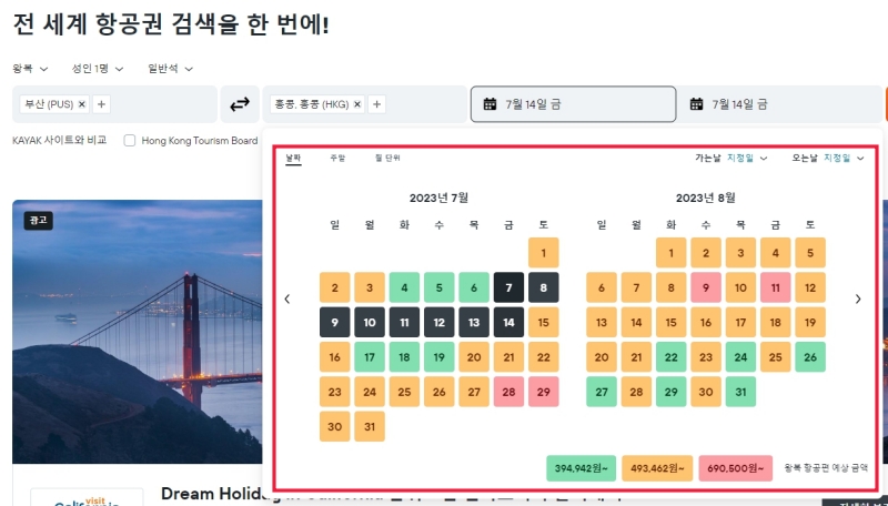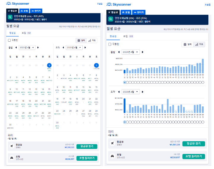 1. 특정 날짜와 출발지 도착지를 설정하면 저렴한 기간을 확인할 수 있습니다. 차트나 그래프로도 비교할 수 있어 편리합니다.