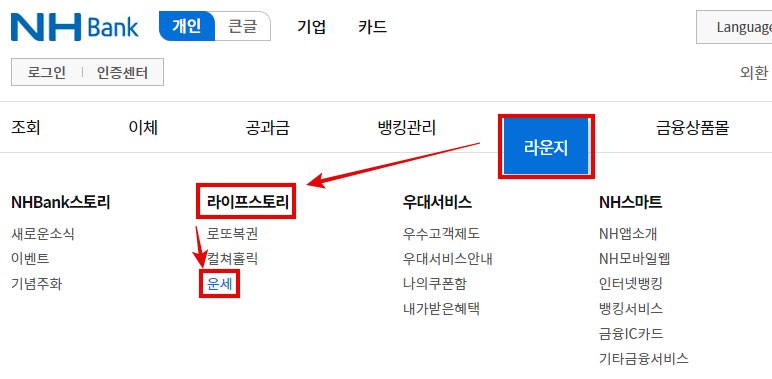 농협은행 홈페이지에 접속하면 상단의 큰 카테고리 중 '라운지' 카테고리를 클릭합니다. '라이프스타일' > '운세'로 접속합니다. 정통운세, 평생운세, 월간 종합운세, 오늘의 운세를 볼 수 있습니다. 이 밖에도 재물운세, 퓨전운세, 꿈해몽, 띠별 운세, 사상오행, 심리테스트 등 볼거리가 다양합니다.